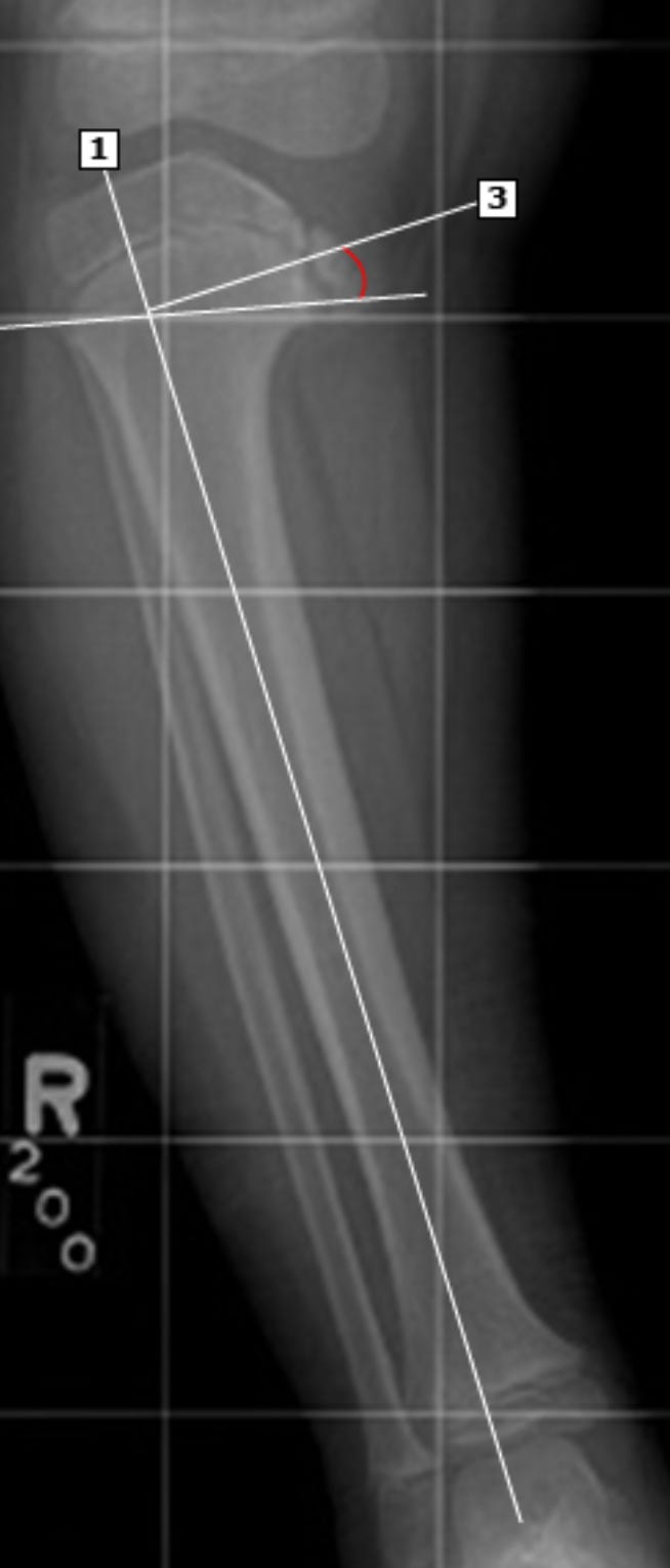 Угол между метадиафизарный угол измеряется на переднезаднем рентгеновском снимке коленного сустава в положении стоя следующим образом: 1) проводится линия вдоль продольной оси большеберцовой кости (линия 1); 2) проводится линия через вершины проксимального метафиза большеберцовой кости (линия 2); 3) проводится линия, перпендикулярная линии 1, в точке пересечения линий 1 и 2 (линия 3); 4) измеряется угол между линиями 2 и 3 — это и есть угол между метафизом и диафизом большеберцовой кости. Значение угла ≤11° указывает на физиологическую, а не патологическую О-образную деформацию. У этого пациента с болезнью Блаунта метадиафизарный угол равен примерно 18°.