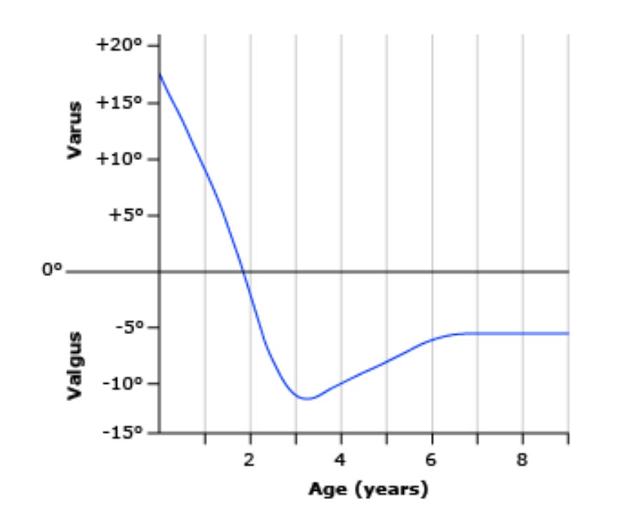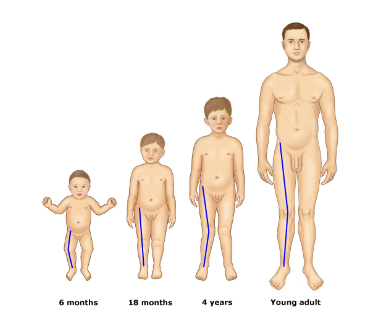 Ось нижних конечностей проходит через последовательность изменений в первые семь лет жизни: от варусной деформации (O-образной) с рождения до примерно 18 месяцев, к нейтральному положению в возрасте от 18 до 24 месяцев, затем к вальгусной деформации (X-образные ноги), и, наконец, возвращается к нейтральной оси. У взрослых ось нижних конечностей обычно имеет небольшой вальгус.